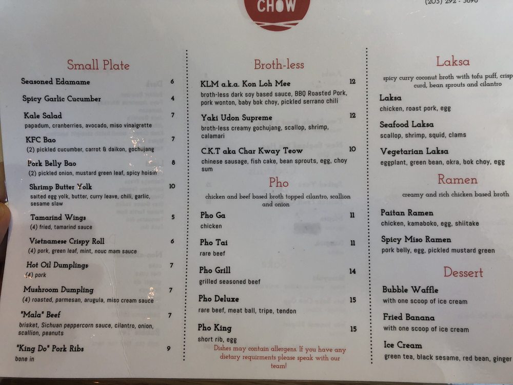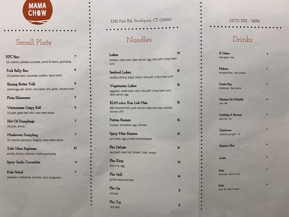 Introducing the menu at Mama Chow, a trendy and casual Asian fusion restaurant in Southport, CT. Known for its extensive small plates selection like Seasoned Edamame and KFC Bao, as well as flavorful Pho options such as Pho Ga Chicken and Pho King Short rib. The ramen dishes, like Paitan Ramen and Spicy Miso Ramen, are a must-try for noodle lovers. Customers rave about the generous portions, reasonable prices, and top-notch service. Mama Chow's authentic South East Asian comfort food has garnered praise from diners, with favorites like Hot Oil Dumplings and Pork Belly Bao earning high marks. The welcoming atmosphere and consistently delicious dishes make Mama Chow a standout choice for Asian cuisine in the area. Venture to Mama Chow for a unique dining experience and a taste of comforting, flavorful dishes.